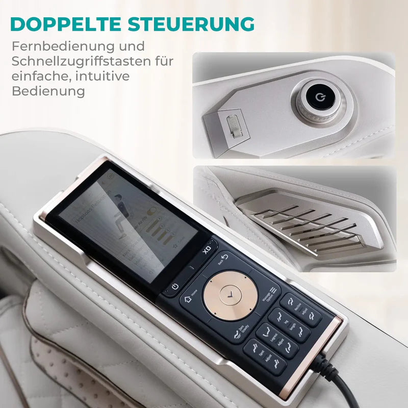 Für den schnellen Zugriff sind die wichtigsten Tasten zusätzlich direkt in die Armlehne integriert. So lässt sich jede Einstellung mühelos erreichen, ohne den Moment der Ruhe zu unterbrechen.