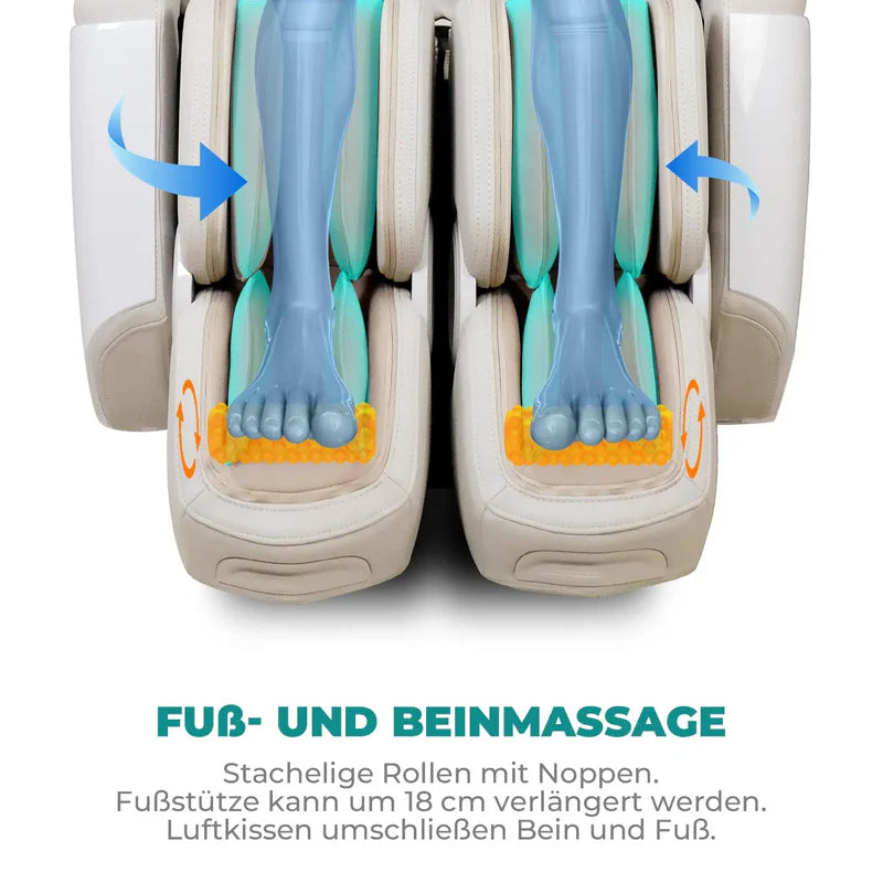 Das Herzstück ist die Cycling Funktion mit asynchroner Beinbewegung. Während dein Oberkörper vollkommen entspannt bleibt, bewegen sich die Beine in einem sanften Wechselspiel, ähnlich einer gleichmäßigen Tretbewegung. Diese rhythmische Dynamik regt die Durchblutung an, lockert Muskeln und vermittelt ein Gefühl von Leichtigkeit und natürlicher Balance.