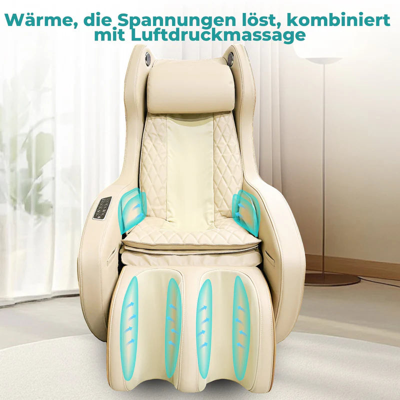 Sanfte Wärme aktiviert das Gewebe, während die Luftdruckmassage an Schultern, Hüfte und Beinen mit ruhigem Rhythmus Verspannungen löst.